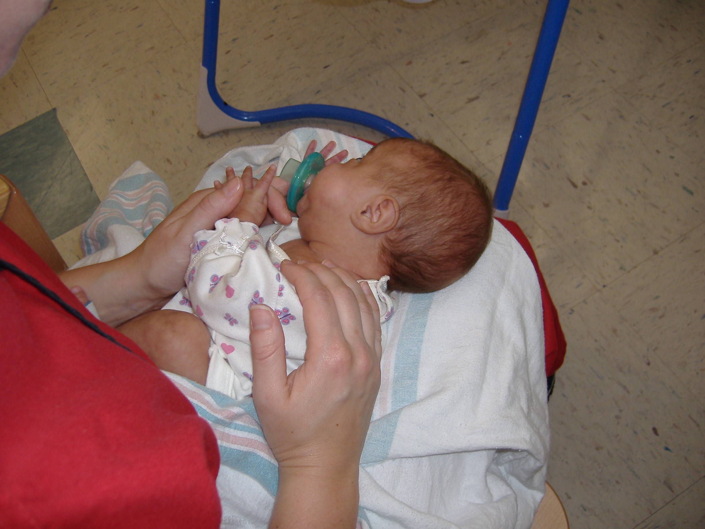 • Exercise: Bring the top hand toward baby’s mouth and stroke the side of the mouth with his hand.  The baby will want to suck on their hand.  Let him!  When he is done, bring hands together with gentle pressure,, this is very calming.