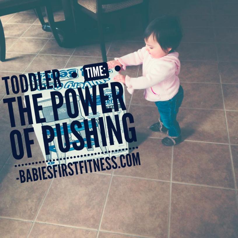 Pushing activities are great for pre-walkers to older children. It is an activity that you can do with all of your kids. Pushing activities strengthen the muscles in the front and the back of the body in balance, this means that the abdominals and pectoral muscles are strengthened in balance with the hip extensors and back muscles. If you choose to push lower objects (see picture in comments) your child is lengthening his hamstrings and activating the muscles on the front of his foot (dorsiflexors). This is great for all those kids who walk on their toes out there!